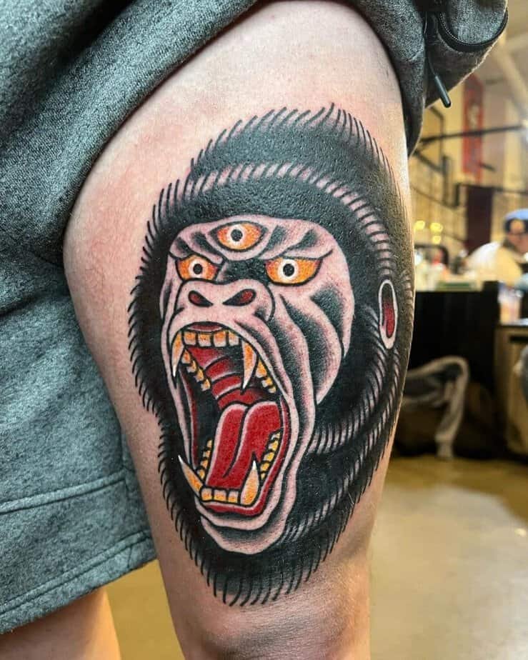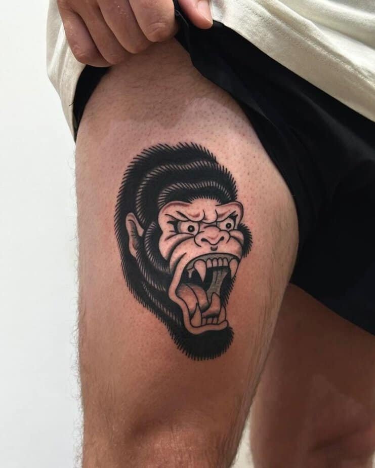 Blackwork gorilla on the thigh — big contrast, big impact