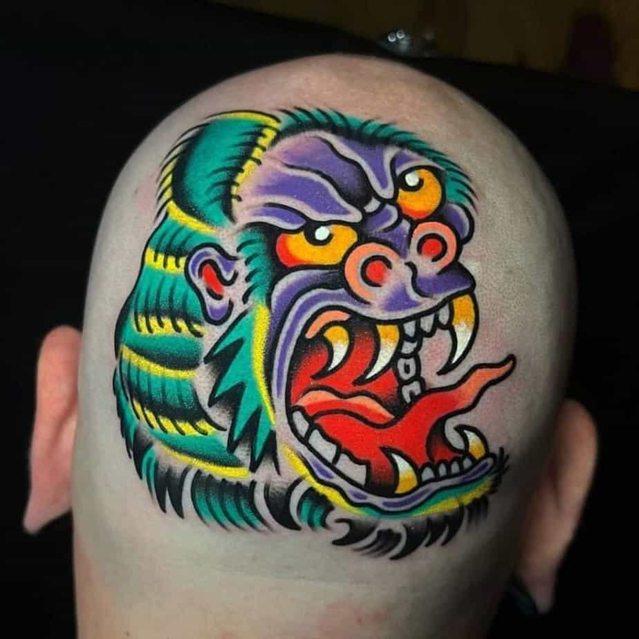Head tattoos are the ultimate leap. Whether you’re shaving to reveal the art or using it to reclaim your crown, a gorilla on the head is intimate and in-your-face. Not for the faint-hearted, but undeniably fierce.