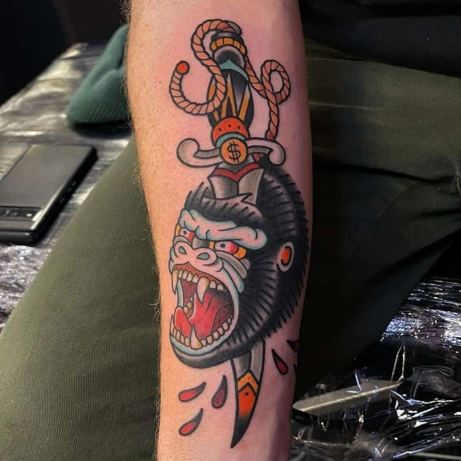 Daggers have been tattoo shorthand for complex themes — betrayal, protection, sacrifice. Put one with a gorilla and you create a little drama: strength paired with danger and history. It’s symbolic but still visually striking.