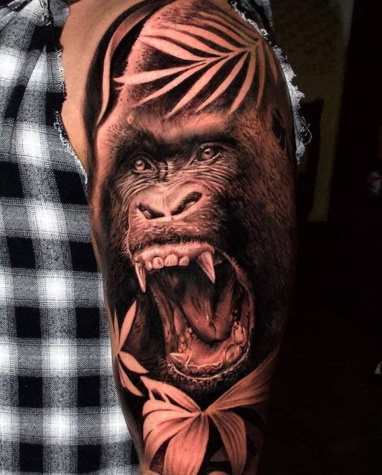A big, realistic gorilla on the upper arm — dramatic and wearable