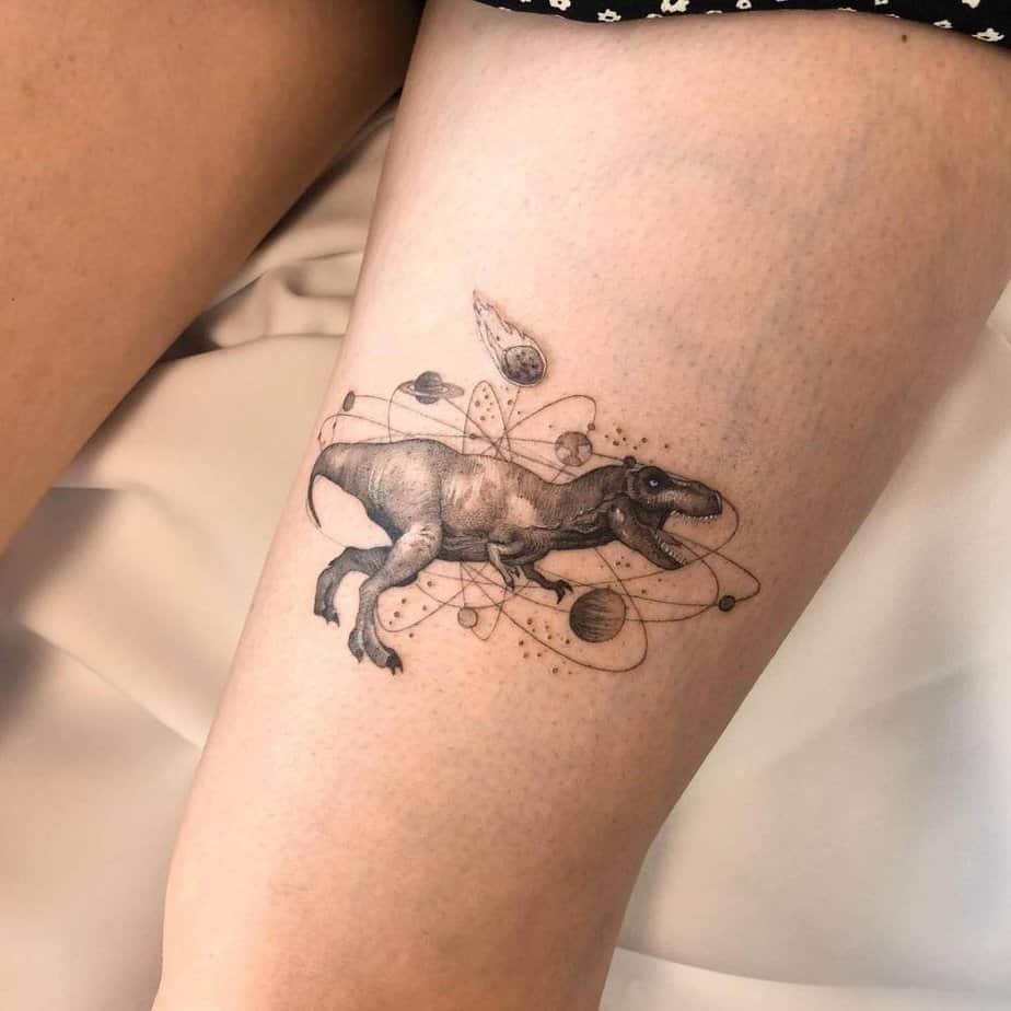 This thigh design is delightfully whimsical: a little T‑Rex surrounded by swirling galaxies. It’s playful on the surface but nods to ancient power — equal parts cute and intimidating, which I adore.
