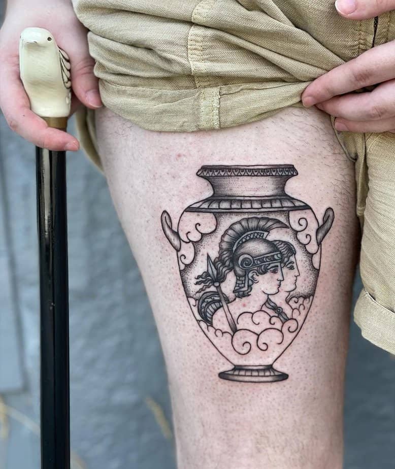 This thigh piece is basically a nod to ancient pottery — Achilles and Patroclus rendered like they belong on a hydria. It’s elegant and intimate at once: warrior and companion side by side, loyalty and history stitched into skin. I love that it feels like someone paused a heroic moment and made it permanent.