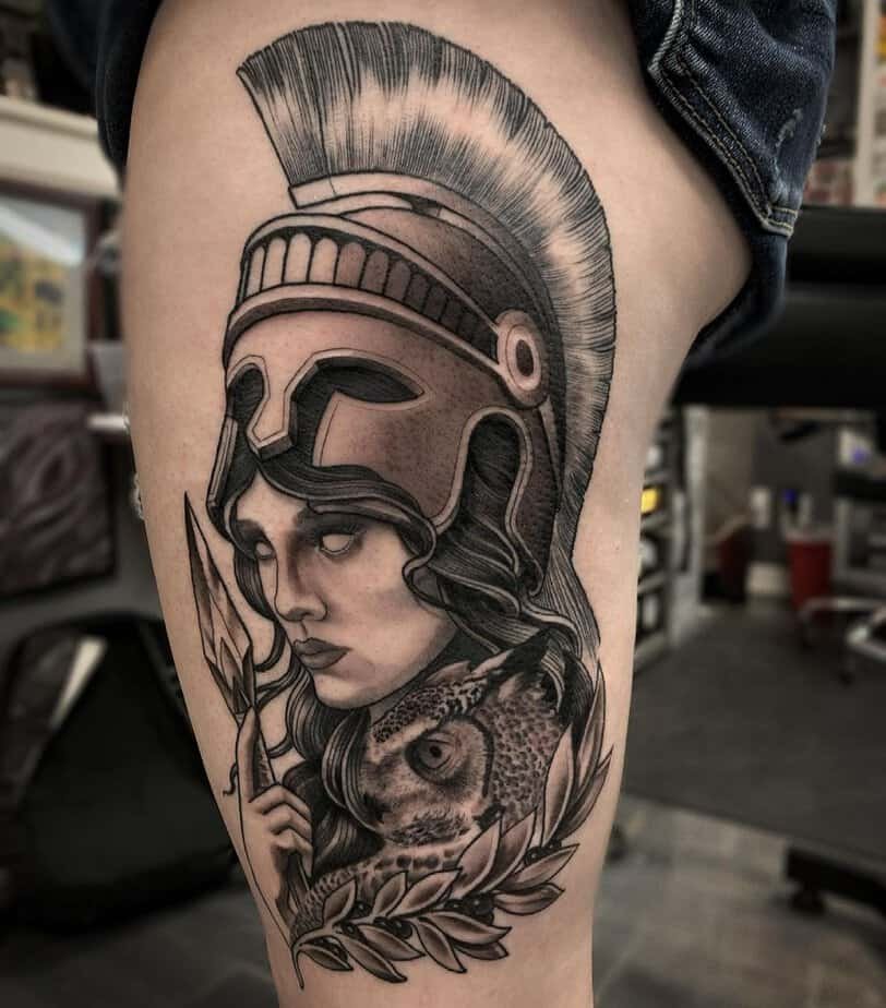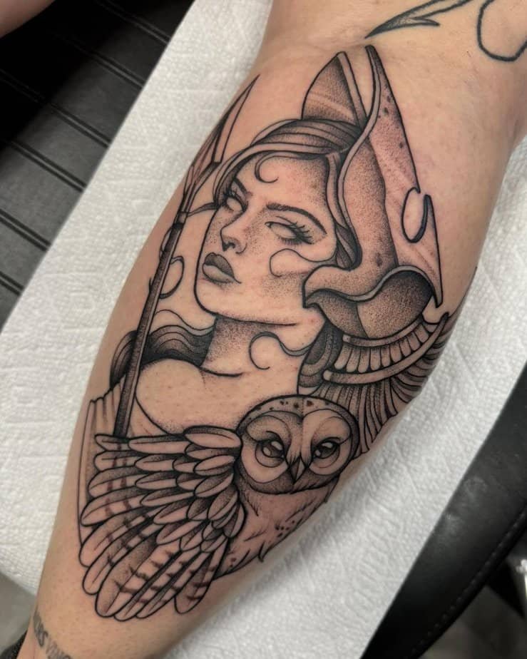 Athena shows up here all regal — helmet, wise owl, and that looping olive branch that softens the whole thing. It’s such a neat combo: strategy and foresight paired with peace and prosperity. Honestly, it’s one of those tattoos that feels like it could be both armor and advice.