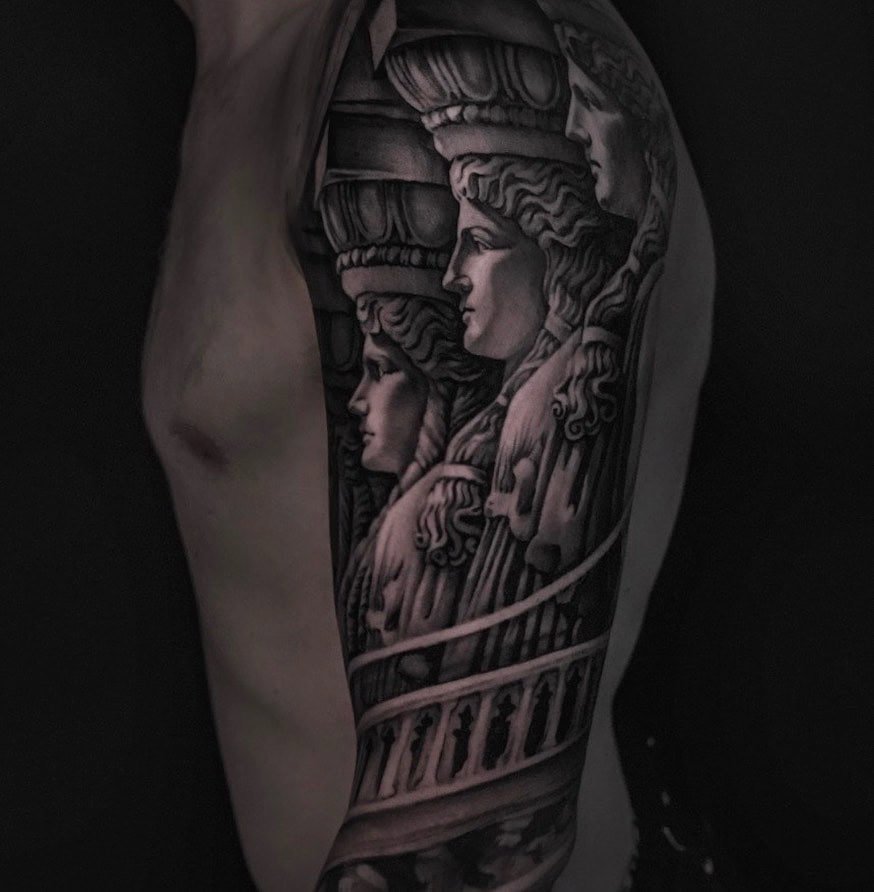 Caryatids on an arm sleeve are so elegant — those sculpted female figures supporting an entablature feel like a tribute to feminine strength. They’re less about fight and more about timeless support and poise. Honestly, it reads like architecture and poetry had a baby.