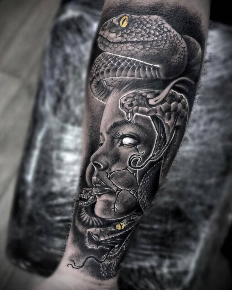 Forearm Medusa — cold gaze, fierce detail