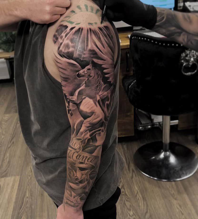 This Ares sleeve is bold — every line, every shadow, screams war and bravado. The helmet details are wild; you can almost hear clashing armor. It’s a piece for someone who wants their ink to carry thunder: fierce, unapologetic, and unforgettable.