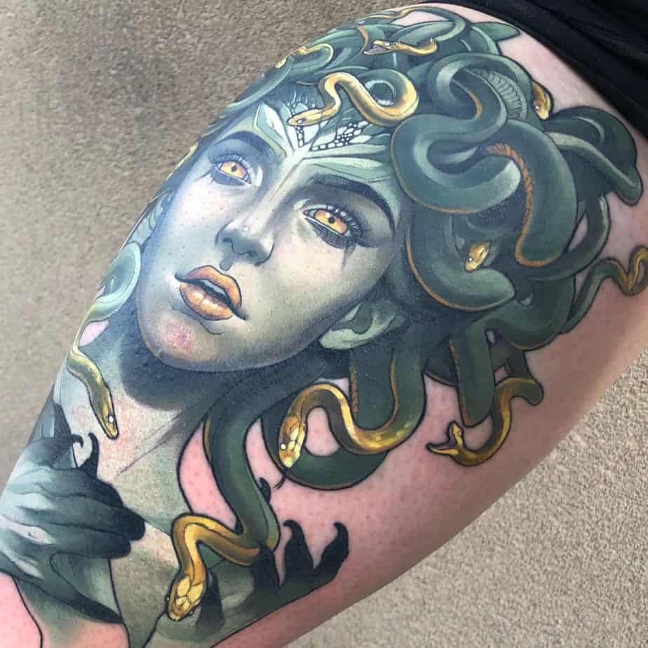 Medusa in teal and gold — powerful, not just scary