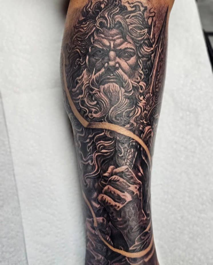 Poseidon as a calf piece gives off big sea-god energy — trident-ready and king-of-the-depths serious. There’s a primal, elemental feel to it: salt, storms, horses, and earthquakes all wrapped into one image. If you love the ocean’s unpredictability, this is the vibe.
