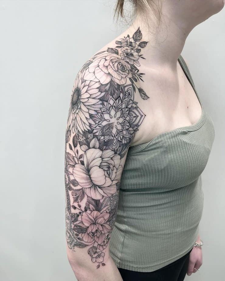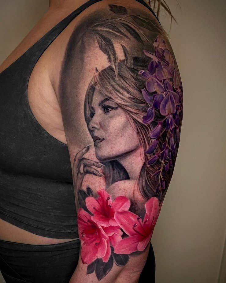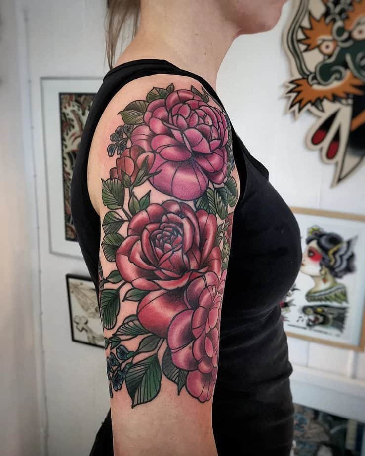 If you love color, this rose sleeve is for you — lush pinks and greens that really sing. Roses are classic symbols of love and beauty, and here they’re unapologetically vibrant.
