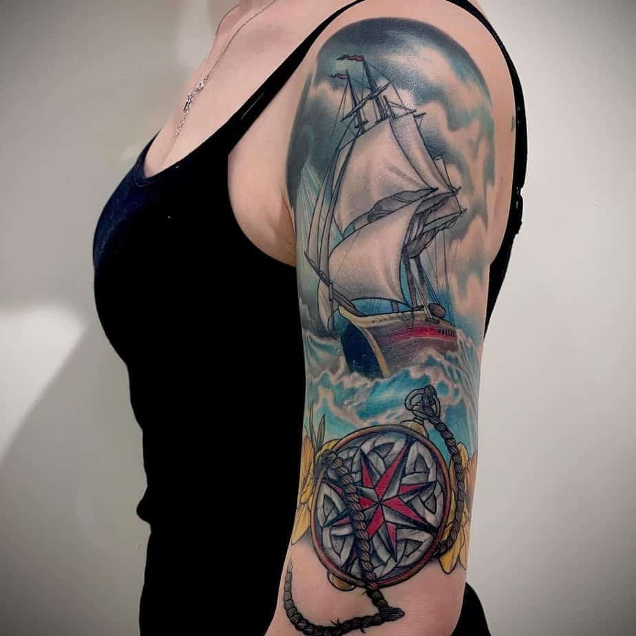 This one’s for explorers: a ship braving choppy water with a bold compass below. It’s the kind of tattoo that feels like a promise to keep searching and to trust your direction, even when things get rough.