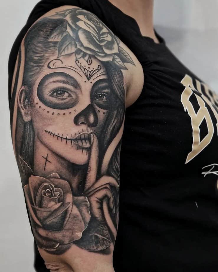 This Día de los Muertos-inspired piece mixes delicate facial details with roses and a hint of mystery — that finger over the lips makes it feel like she’s holding a secret. It’s a beautiful tribute to remembrance and the cycle of life.