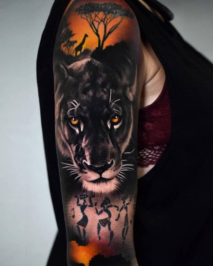 This lioness piece hits you with raw power — those amber eyes, the silhouettes of giraffes and acacia trees, and the warm sunset tones behind her. It’s simultaneously fierce and cinematic, like carrying a whole savannah mood on your arm.