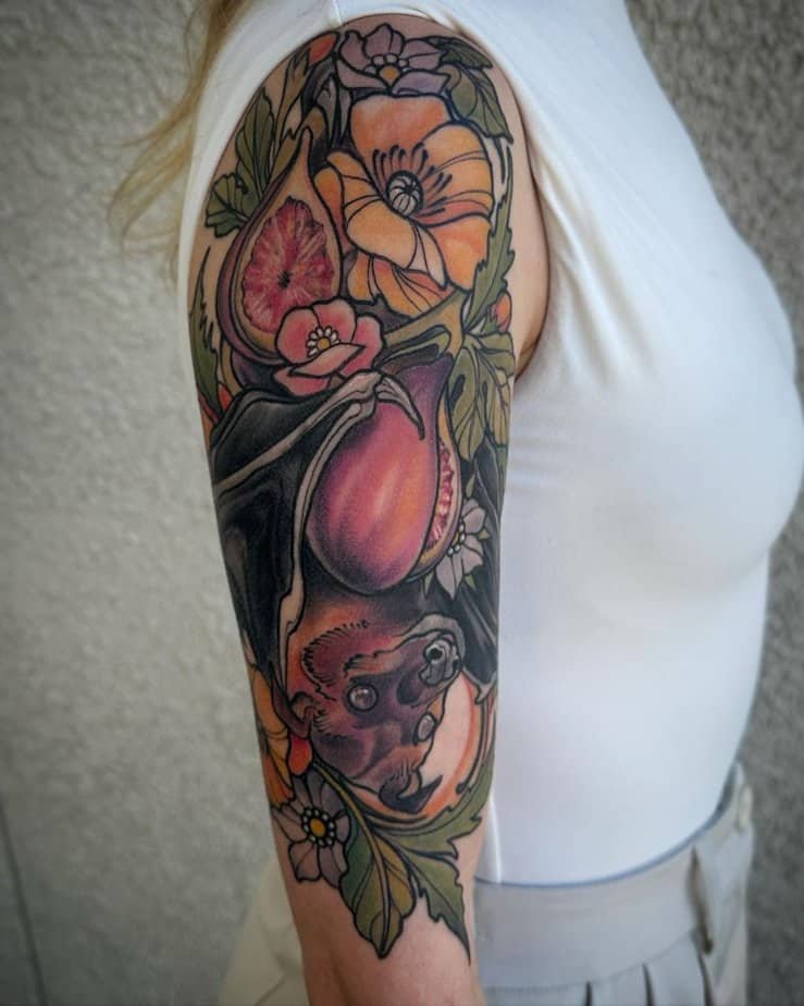 This one mixes the unexpected — a bat with figs and flowers — and it somehow works. The bat can symbolize rebirth, the fig abundance, and the florals add softness, so it’s playful with a deeper meaning.