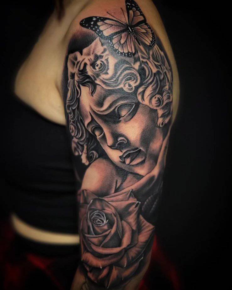 This one’s like a little myth: a serene goddess with flowing hair paired with a delicate butterfly. It reads as elegance plus transformation — a reminder of inner strength and graceful change.