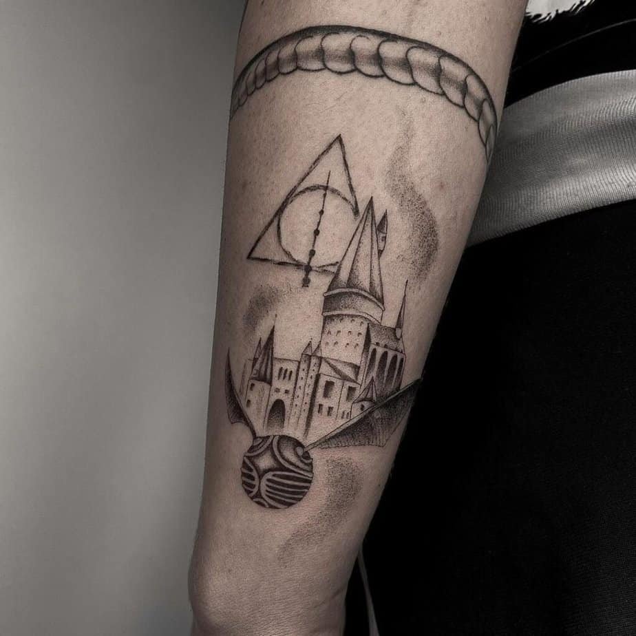 We all dreamed of that Hogwarts letter — so why not have the castle as a permanent reminder? Some designs tuck the school into a triangle shape with crisp, tiny details so it doesn’t blur into a black blob from a distance. Others put Hogwarts center-stage and add little extras around it; splashes of orange or blue break up grayscale and make the whole piece feel like a scene from the movies.