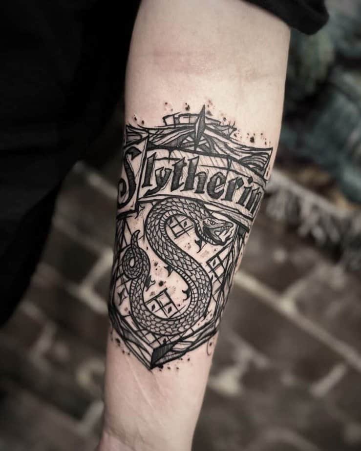 Mixing black with a pop of color — like gold-toned Snitch shading — gives vintage-meets-magical energy. House emblems are another choice: whether you’re proudly Slytherin or repping another house, an emblem can be bold and meaningful. And yes, Dobby tattoos exist and they hit the heart; done in a slightly traditional style they feel like a sweet, classic tribute.