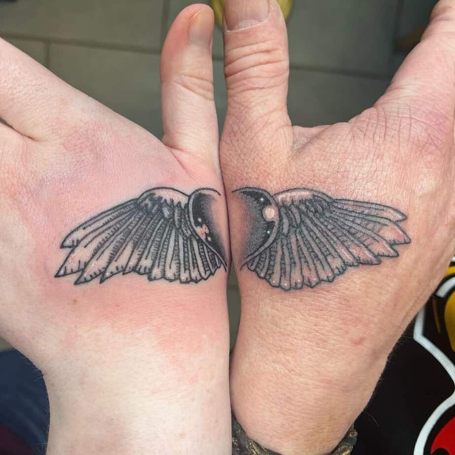 Matching winged hearts on the hand? Adorable. Whether it’s your best friend, your partner, or your sister, every little reach reminds you of them. It’s like a tiny, inked promise that’s visible in all the sweetest, everyday moments.