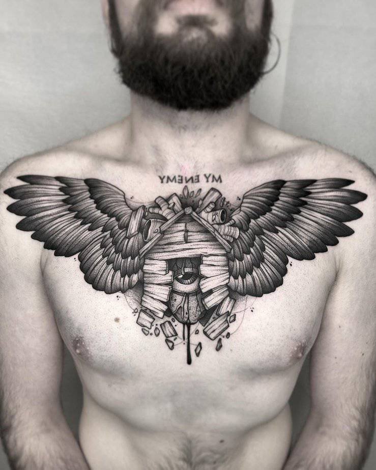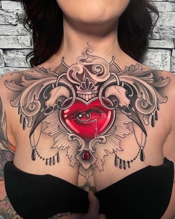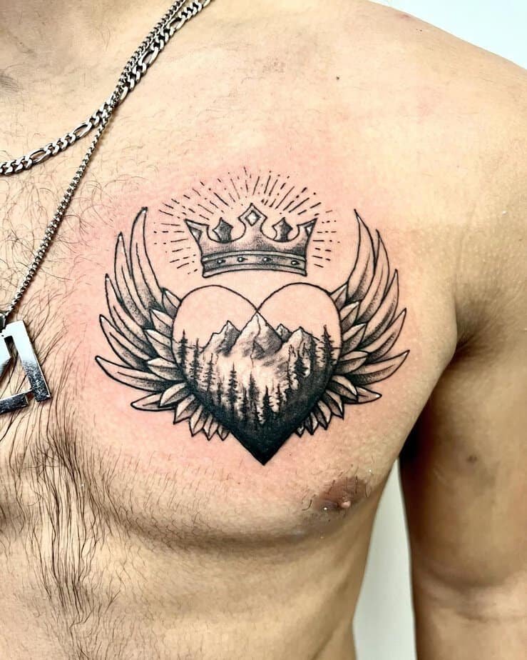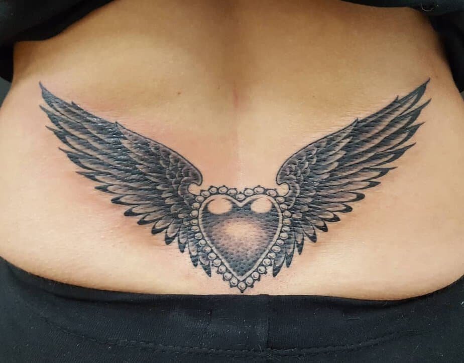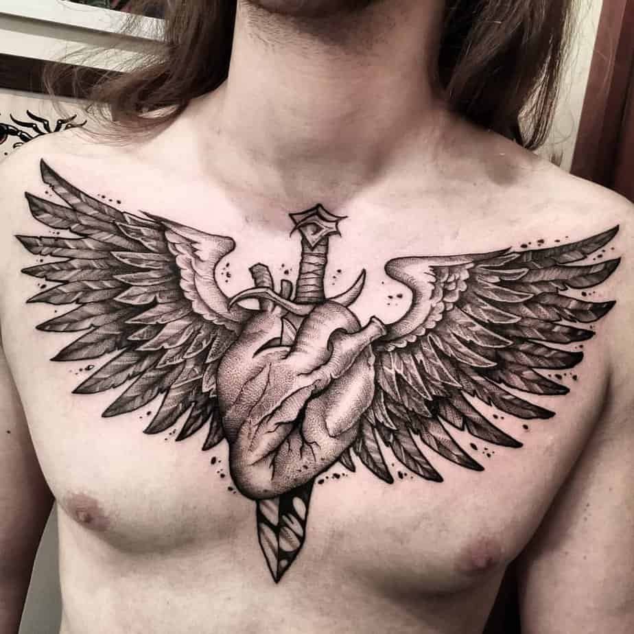 This chest piece doesn’t whisper — it roars. Big wings, a strong heart, and placement that says you wear your story proudly. It’s fierce and unapologetic, the kind of tattoo that makes people look twice and remember you. If you want a visible badge of feeling, this is it.