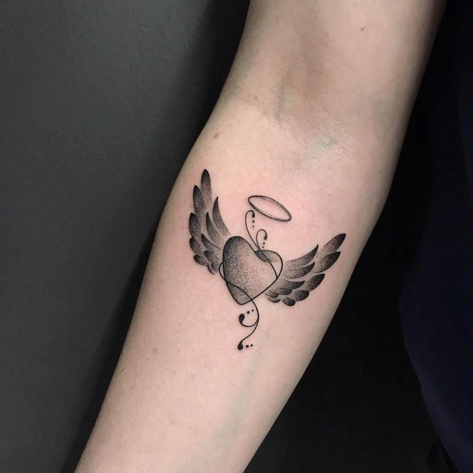 This dotwork angel heart feels celestial without being precious. The stippled shading gives it a soft depth, like someone sketched a halo into your skin. It’s the kind of piece that looks tender up close and kind of magical from across the room — perfect when you want a tattoo that feels both gentle and meaningful.