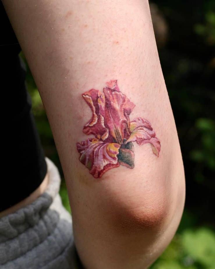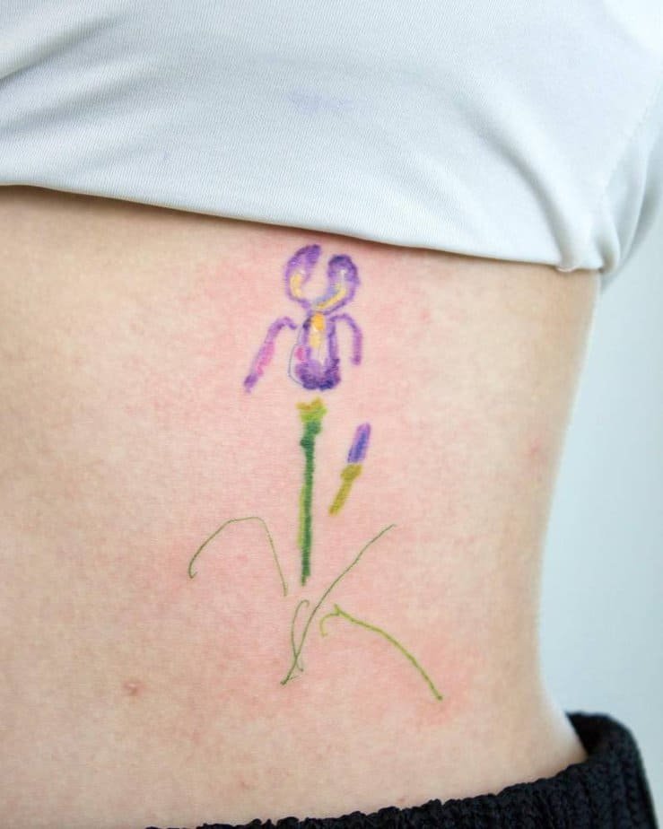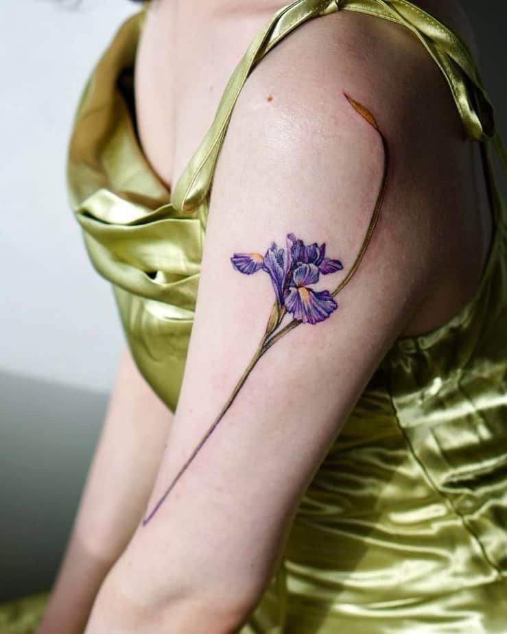 Okay, if you want a tattoo that gets noticed, the upper arm iris does that in the best way. The long stem and vivid petals create a vertical flow that’s dramatic but tasteful. It’s great for people who don’t mind the spotlight — whether you’re in a tank or sleeves, this one will start conversations. It’s confident, colorful, and just the right kind of bold.