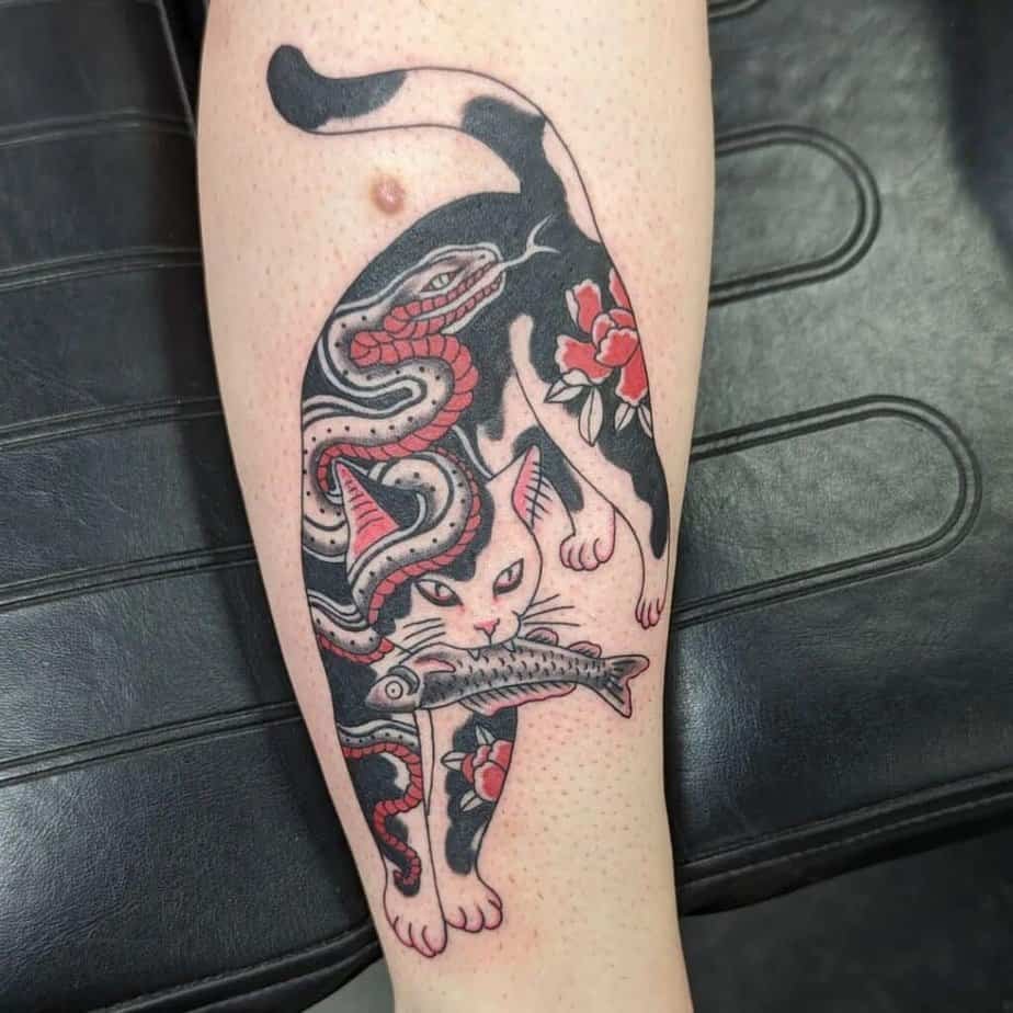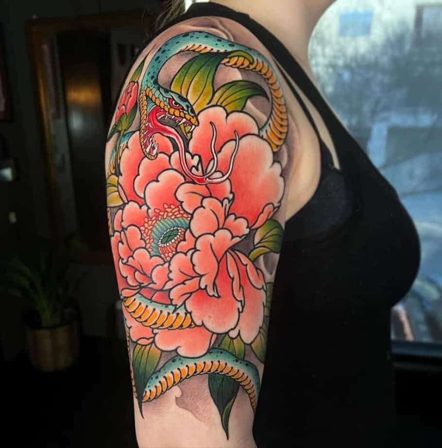 This one pairs a sinuous snake with a bold peony, which makes for a colorful, eye-catching combo. If you want something vibrant and a little edgy, this mix reads dramatic in the best way.