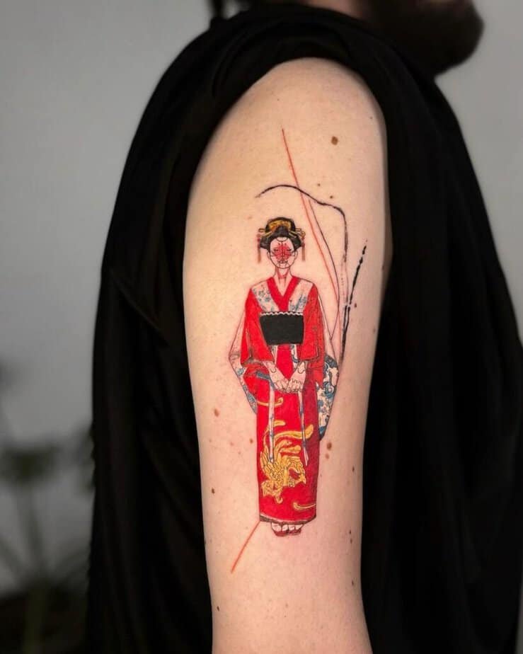 Geishas represent beauty, grace, and femininity, so a geisha tattoo can be delicate and evocative. It’s a straightforward way to honor Japanese aesthetics with a portrait-style piece.