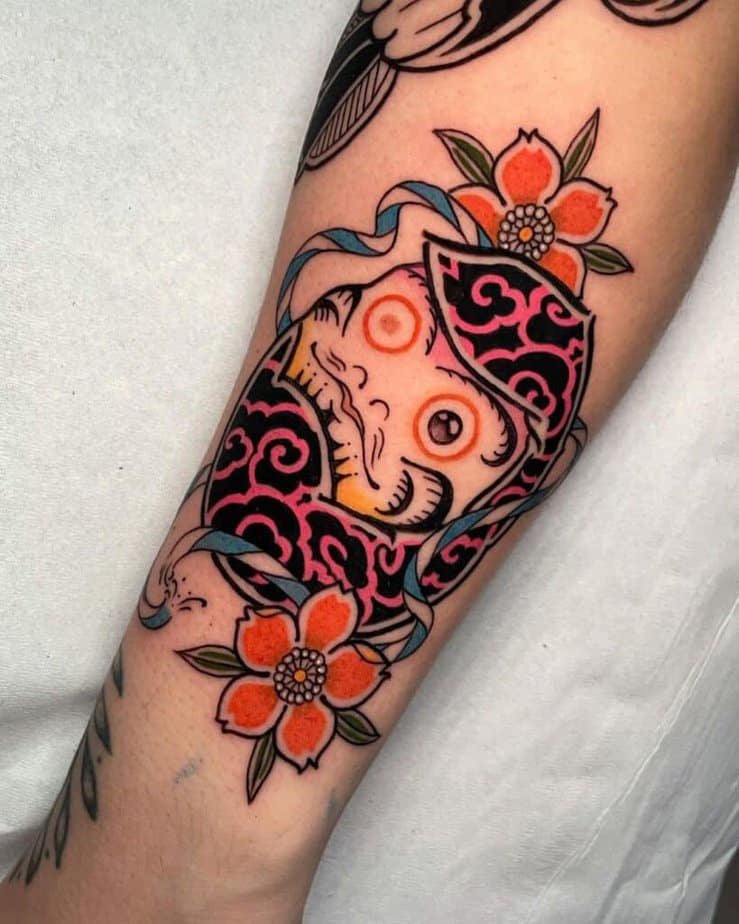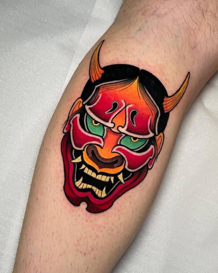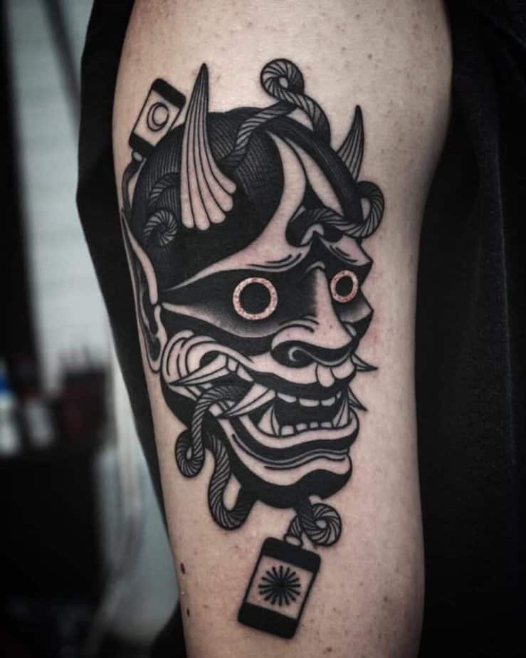 Oni masks are similar in spirit to the Hannya — protective and tied to folklore — but they often lean into a darker, more dramatic palette. Perfect if you’re into black-and-gray work with a bite.