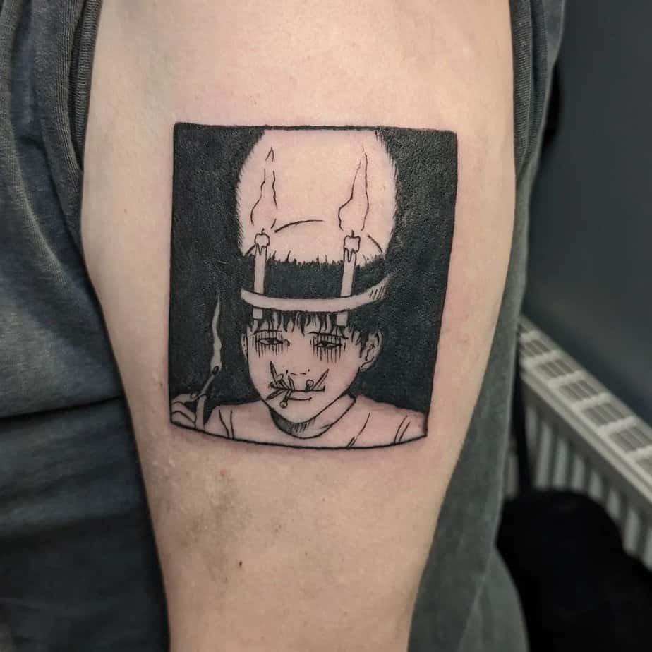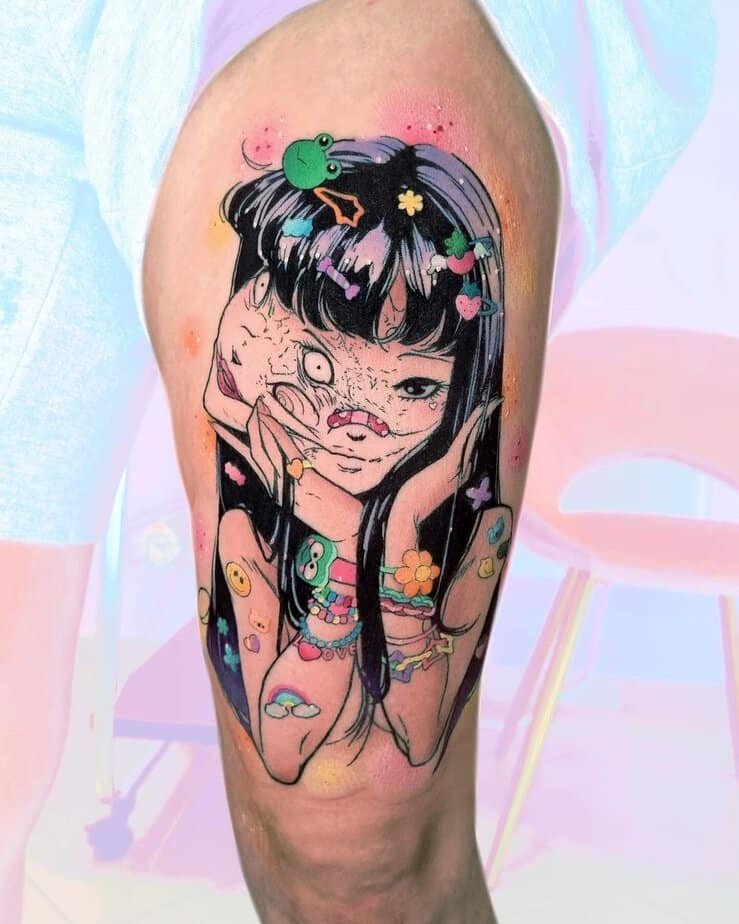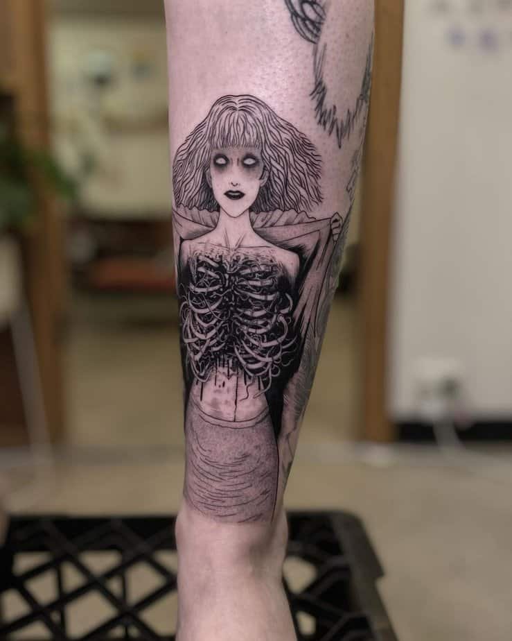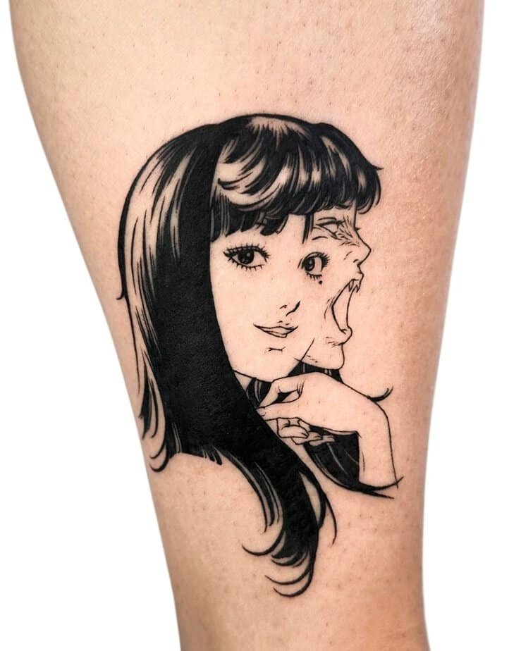This one brings the gross-out, slow-creep vibe of Junji Ito to life — the moment a girl’s face becomes something slimy and wrong, with a slug sliding out of her mouth. It’s visceral in the best/worst way: detailed, grotesque, and stubbornly unforgettable. If you love body-horror that makes your skin crawl (in a cathartic way), this is the kind of tattoo that will haunt you—and in a good way.