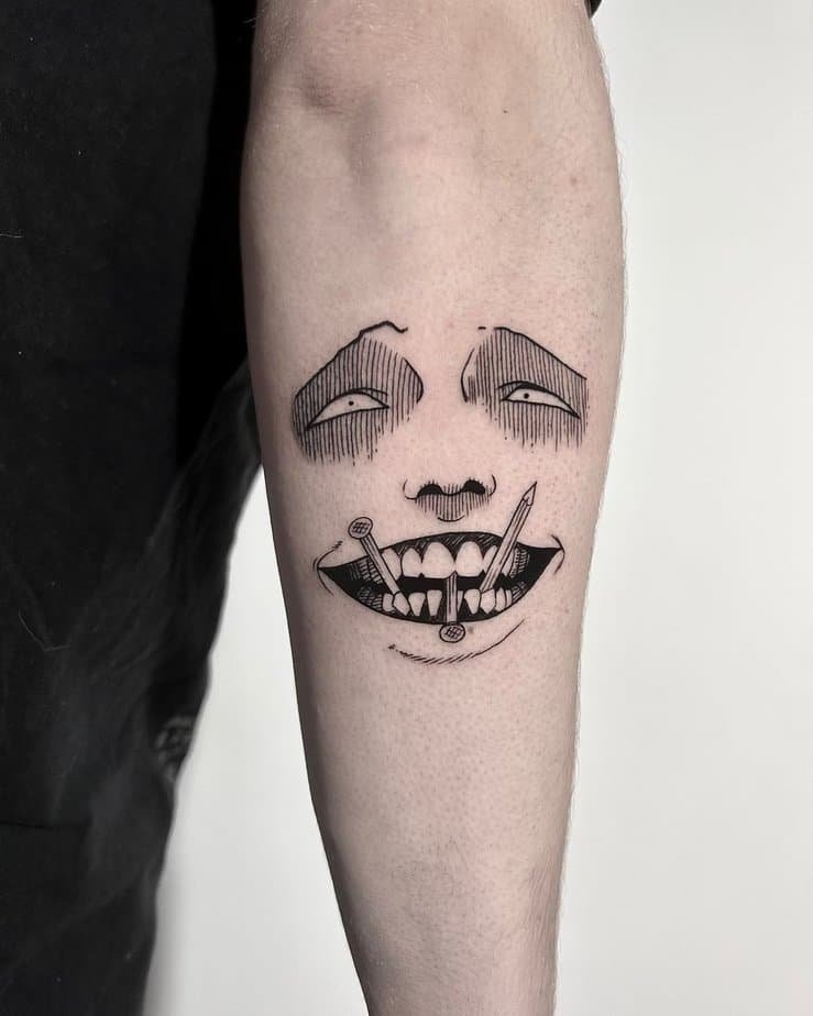 Imagine a smile stretched too far, nails driven through teeth, eyes empty and unreadable—that’s this tattoo in a nutshell. It’s stark and brutal in its simplicity, which somehow amplifies the horror. If you want a piece that will make people do a double-take, this is it.
