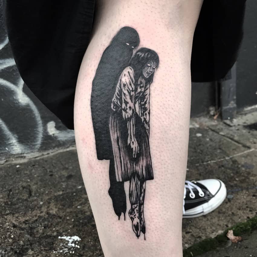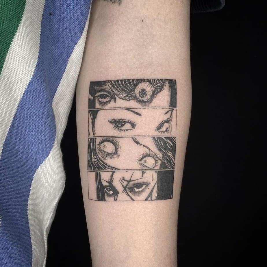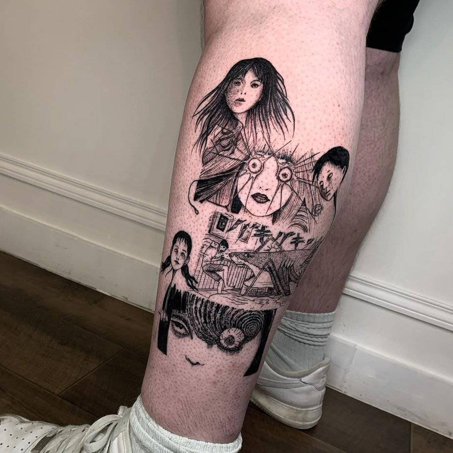 This leg tattoo is chaos in the best way: Tomie here, weird surreal forms there, comic panels broken up and stitched together into one relentless visual overload. For a hardcore fan, it’s a walking encyclopedia of Ito’s nightmares—dense, layered, and full of tiny details that keep pulling you back in.