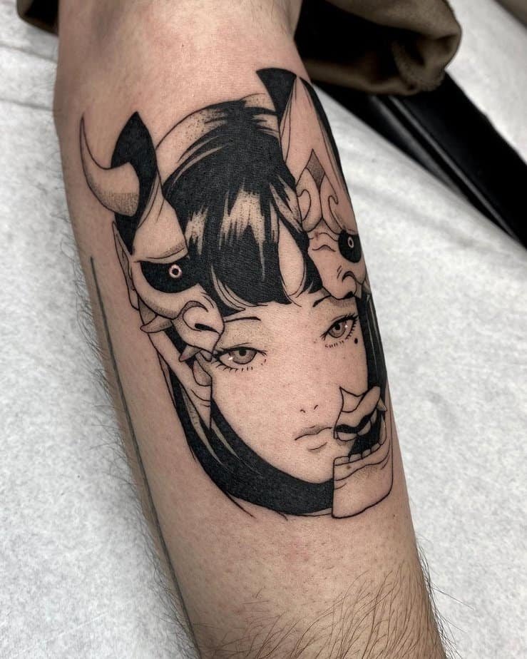 Okay, picture this: Tomie’s hauntingly beautiful face intertwined with a Hannya mask that’s all jealousy and fury. The tattoo mixes delicate linework for Tomie with the brutal angles of the mask, and then—because contrast is everything—those bold red flowers swoop in to remind you life and violence are entangled. It’s one of those pieces you can stare at and keep discovering new things, like a whispered warning wrapped in gorgeous detail.