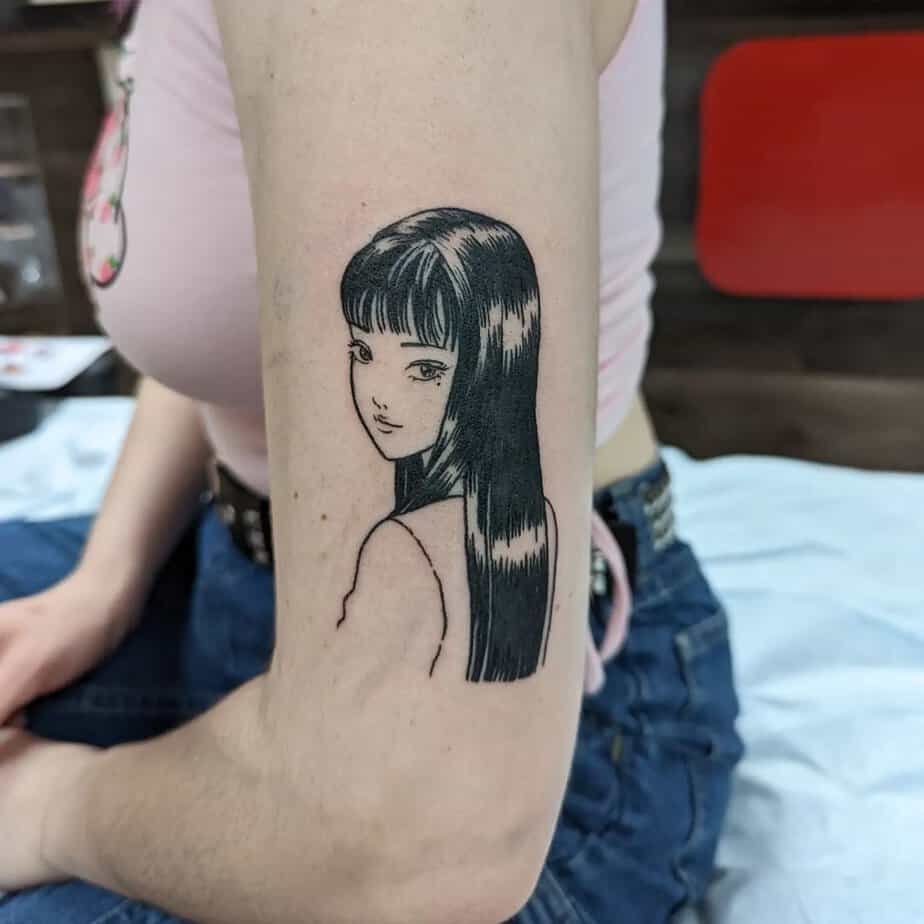 This upper-arm piece looks calm at first glance, but anyone who knows Tomie will feel the chill. Her expression is so deceptively soft, which is exactly the point—underneath that stillness is chaos waiting to happen. It’s a great pick if you want something subtle that still carries a heavy, unsettling vibe.