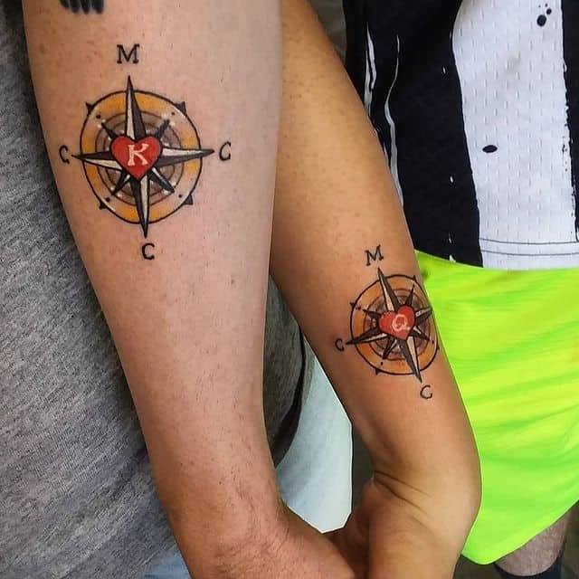 Compasses with little red hearts in the center and letters “K” and “Q” inside — this design says your love is the direction you choose together. It’s romantic and symbolic without being overly ornate.