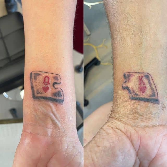 Small puzzle-piece tattoos with a “K” on one and a “Q” on the other are adorable and sentimental. They’re quiet but meaningful — like telling each other you complete one another, one tiny connecting shape at a time.