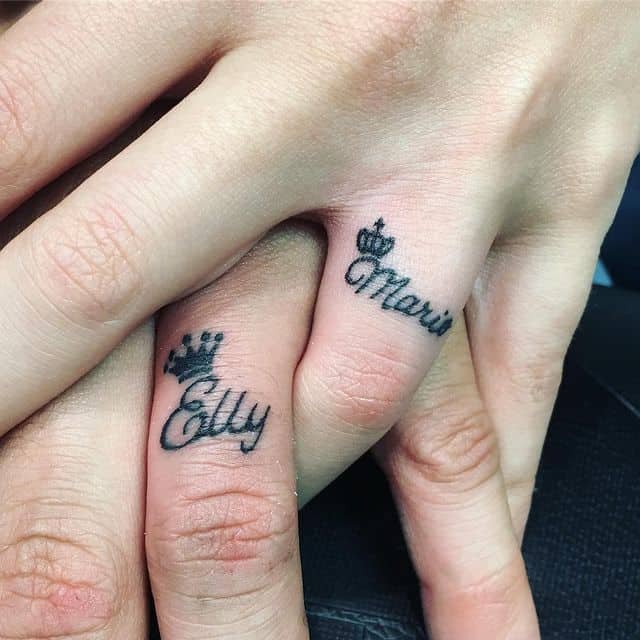 Okay, picture this: his hand wears a king’s crown with a distinguished beard illustrated underneath, and the words “her king” tucked beneath like a soft promise. Her hand mirrors it with a graceful queen’s crown and “his queen” beneath. It’s the kind of matching ink that doesn’t need to shout — it simply says, quietly and confidently, “we’re ruling this little kingdom together.”