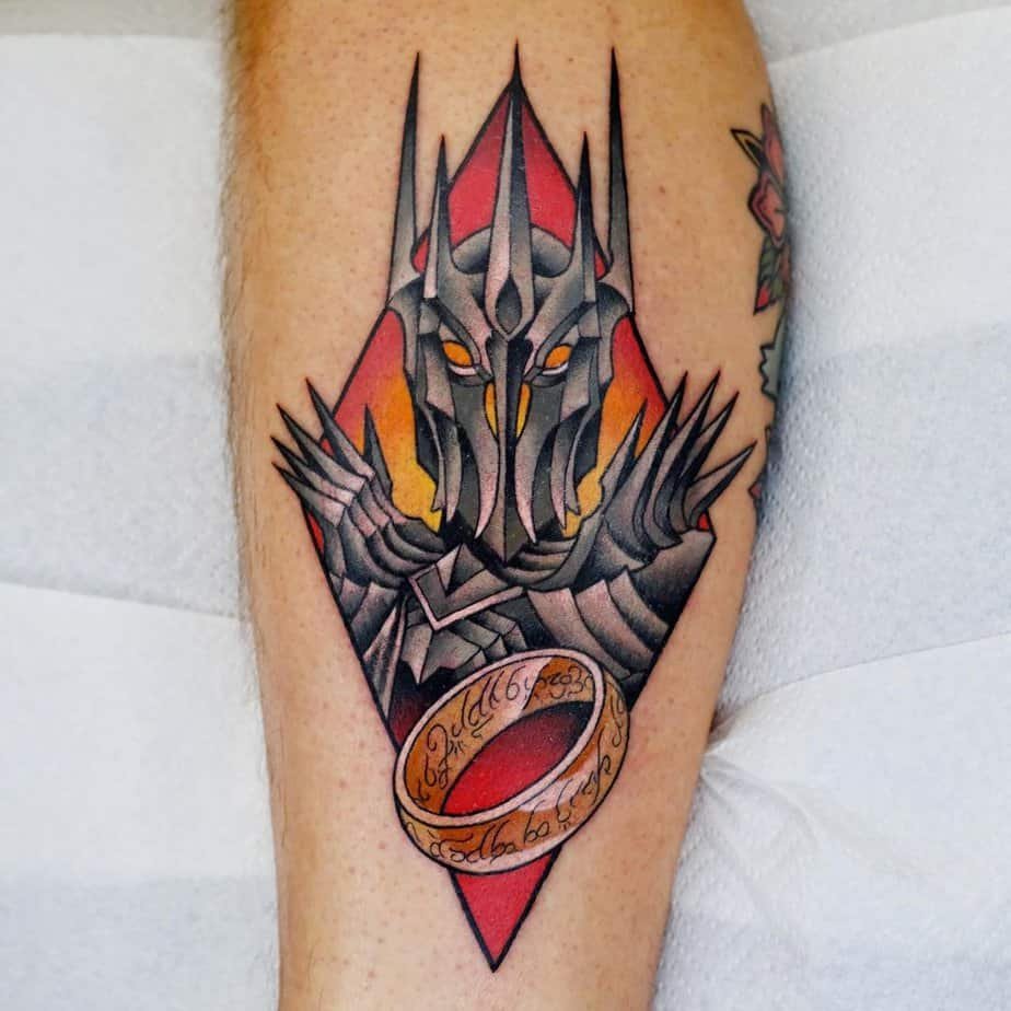 This Sauron piece uses yellow, orange, and red like someone bottled flame and shaded obsession into ink. He’s holding the Ring up front and center, and the whole vibe is sinister and magnetic. If you like big energy villain vibes (but make it art), this is surprisingly cinematic on skin.