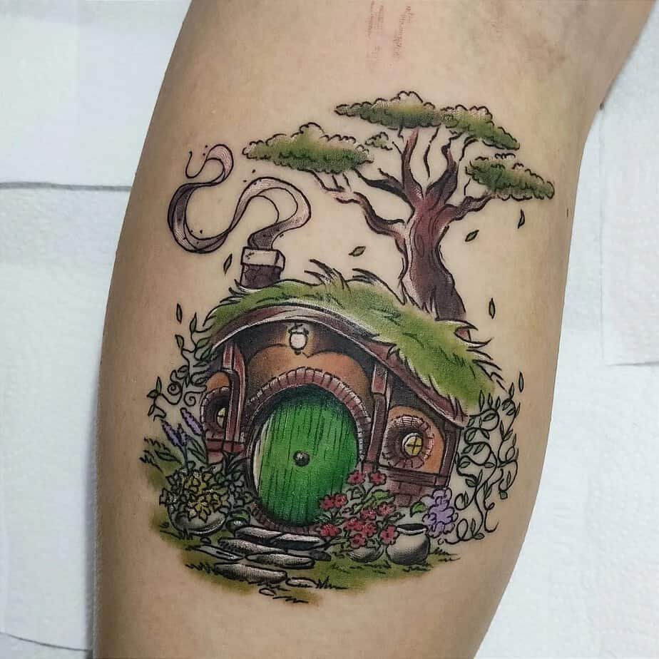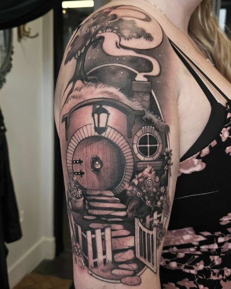 This sprawling back piece leans into the darker side of Tolkien — ancient evils, battles, and shadowy detail. It’s the sort of tattoo that demands commitment and pays off with immersive storytelling on your skin.