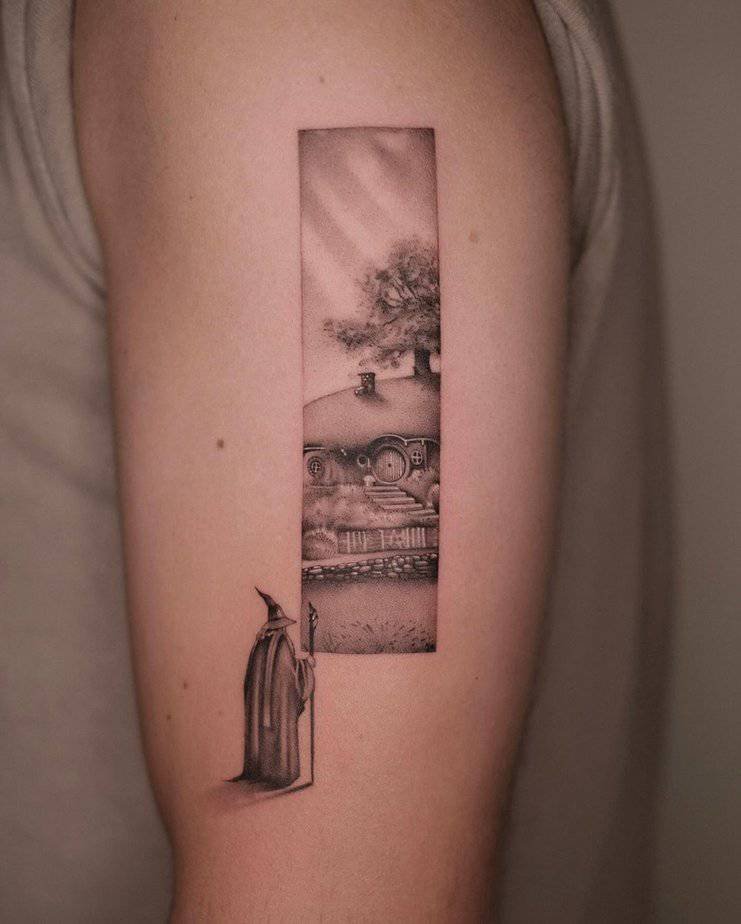 Gandalf’s silhouette, his hat, his staff — all turned toward the peaceful hills of the Shire. It’s quiet and wistful, the kind of tattoo that whispers "protect this place" more than it shouts. Sweet and reflective.