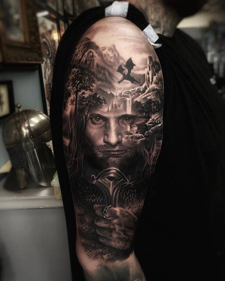 This one is for portrait lovers: detailed shading, rugged features, and all the ranger energy. It reads like a painting on skin. If you want a centerpiece tattoo that honors Aragorn’s nobility and grit, this is stunning.