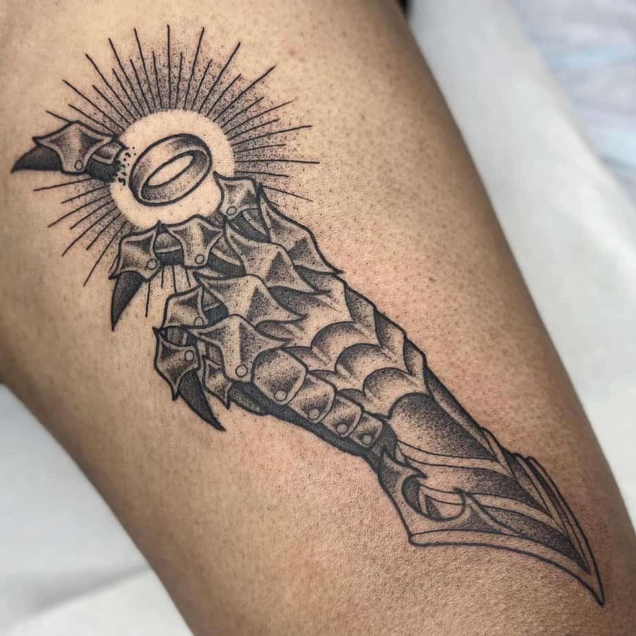 This tattoo captures Eowyn at her fiercest, blade up, eyes blazing, with "I am no man" above. It’s a fierce declaration of identity and bravery. If you want a tattoo that’s both powerful and personal, Eowyn’s stance is a beautiful choice.