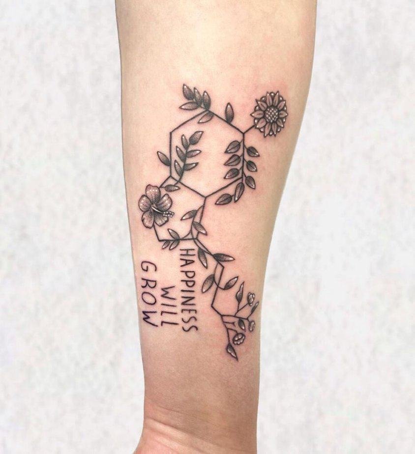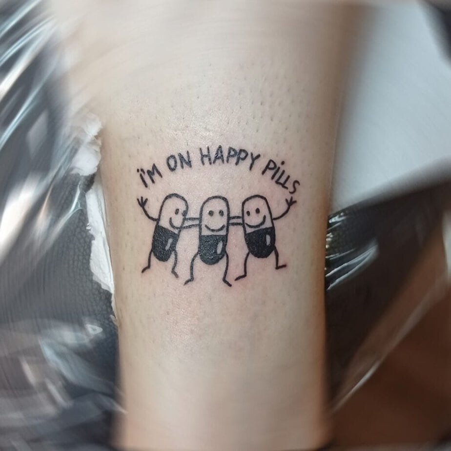Sometimes you just need a little reminder that light exists, even if it’s microscopic. This pill or molecule tattoo that screams ‘serotonin’ can be your permission slip back to calm — a wearable pep talk that says, "You’re allowed to feel better."