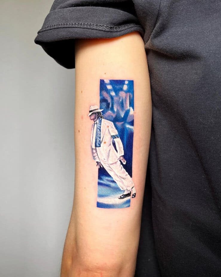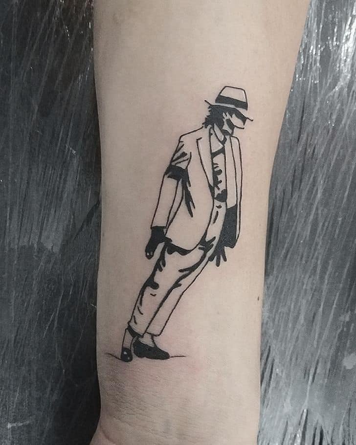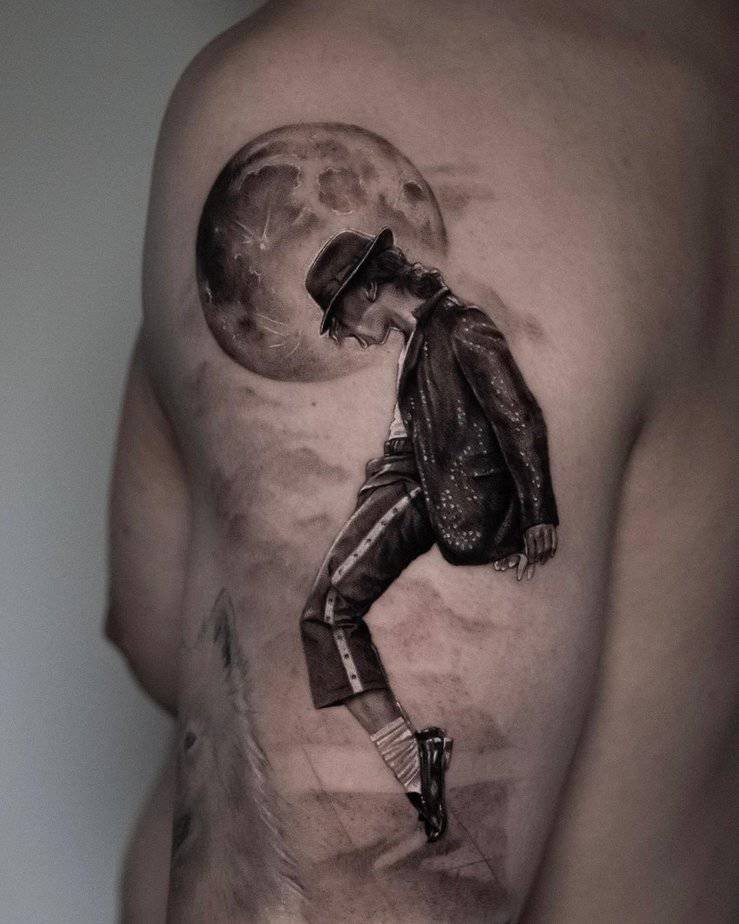 This one is cinematic: MJ mid-moonwalk, shoes and white socks and all, with a cool full moon in the background. It’s theatrical and slightly mystical, like a snapshot from one of his best performances. If you love movement and drama in your tattoos, this is such a fun pick.