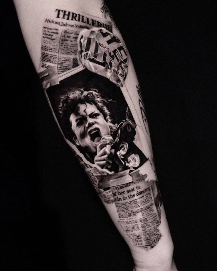This piece reads like a headline — MJ mid-song, full of expression, as if the tattoo itself is announcing his brilliance. It feels celebratory and very expressive, capturing how commanding he could be when he was performing. Perfect for people who want their ink to shout admiration without being tacky about it.