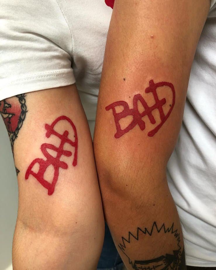 Matching tattoos that spell out "BAD" in bold red — very on-brand and very nostalgic. It’s a simple, punchy way to celebrate not just MJ but the shared memories and songs you and someone else bond over. Totally perfect for pairs who grew up with Thriller and Bad on repeat.