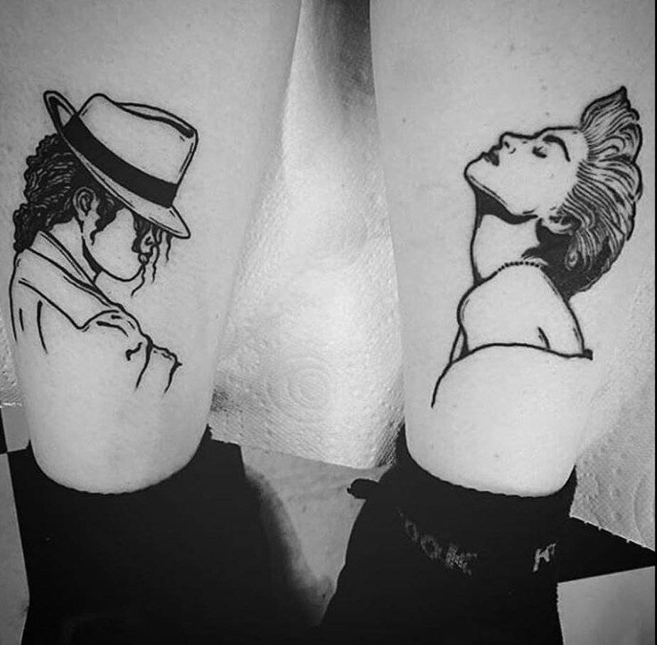 This leg piece paired MJ and Madonna across two legs — king and queen of pop, cheeky and iconic. Michael’s silhouette and Madonna’s fierce vibe make it a playful cultural statement about the soundtrack of a generation. It’s a bold couples-or-friends-tattoo energy that feels both nostalgic and cheeky.