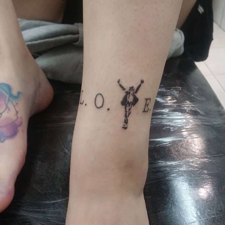 This tiny ankle tattoo spells L.O.V.E and uses MJ’s iconic pose as the V — it’s simple, symbolic, and sweet. I adore how it uses movement to communicate a message of love and unity, which feels so true to his spirit. Low-key but very meaningful.