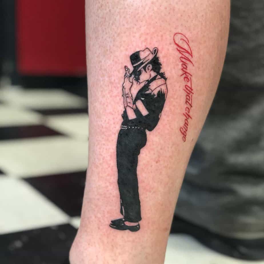 Simple but powerful: a silhouette of MJ tipping his hat mid-move, paired with the words “Make that change” in bold red. It’s the kind of tattoo that reads as both a nod to his dance legacy and a daily reminder to keep striving for better. I love tattoos that double as motivation — this one nails it.