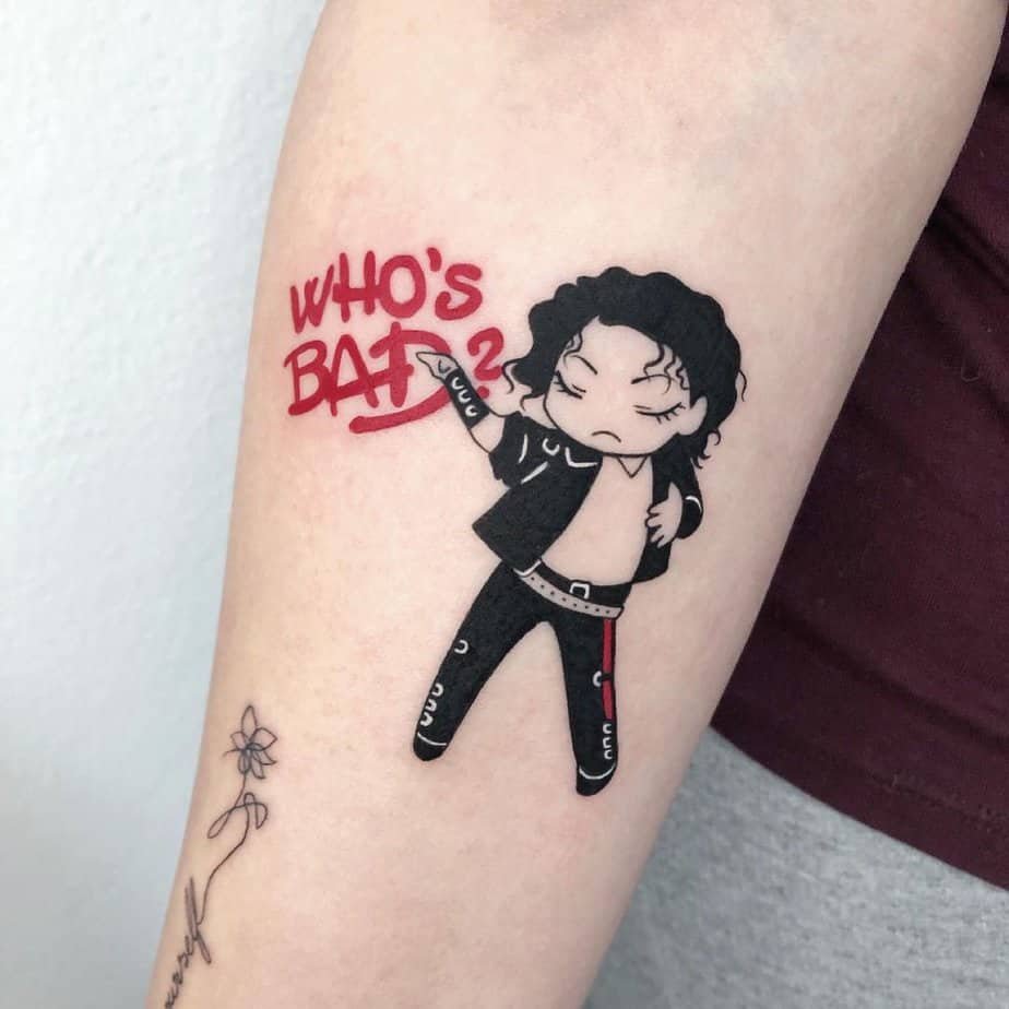 Tiny anime-style MJ in his black suit, striking his famous pose with “Who’s bad?” in red above — this one’s playful and full of personality. It’s a little wink to his rebellious, iconic energy without taking itself too seriously. Perfect for wrists or behind the ear if you want something small but memorable.