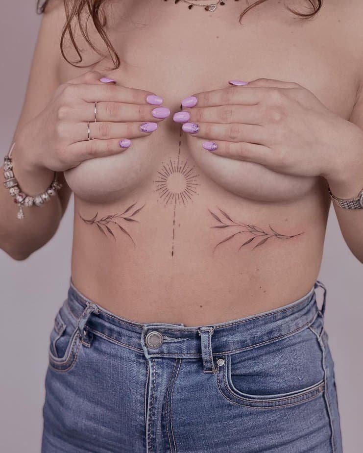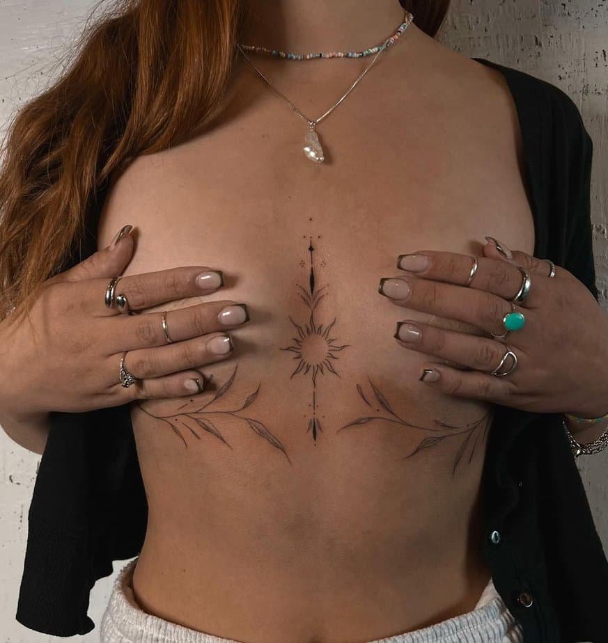 Ending on a green note: botanical sternum tattoos hug the body with leaves and branches, giving you a natural, organic feel. They’re fresh, beautiful, and somehow grounding.