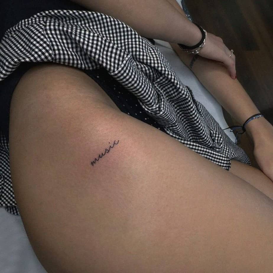 Thigh tattoo for a playful music nod